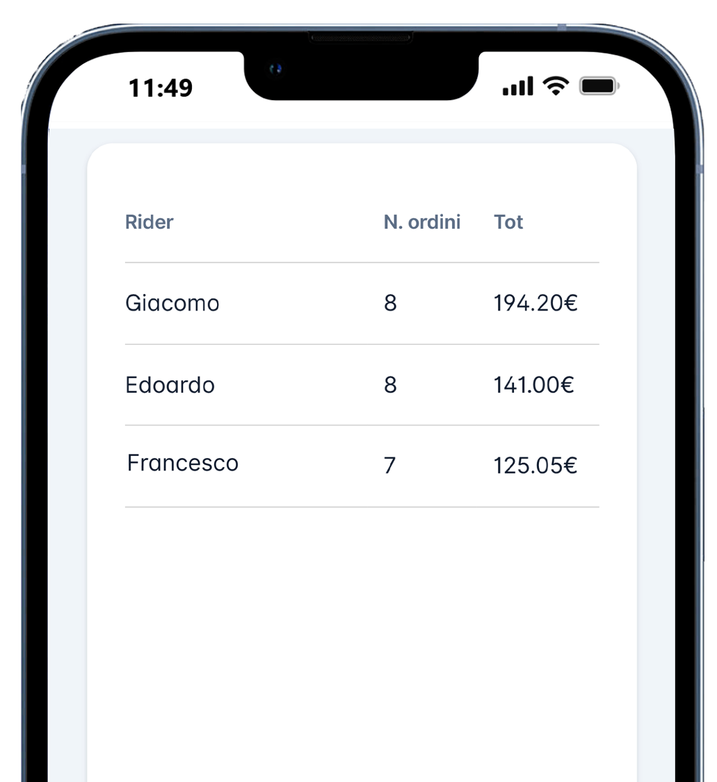 Per ogni rider avrai anche tutto l'elenco degli ordini con indirizzi, orari di consegna e tutti i dettagli